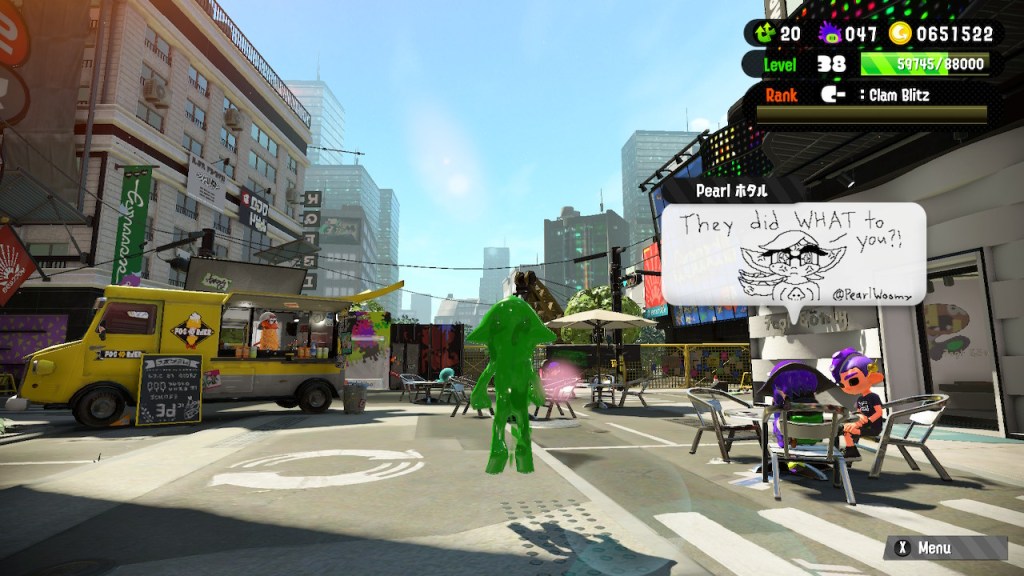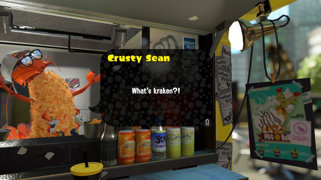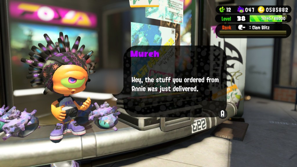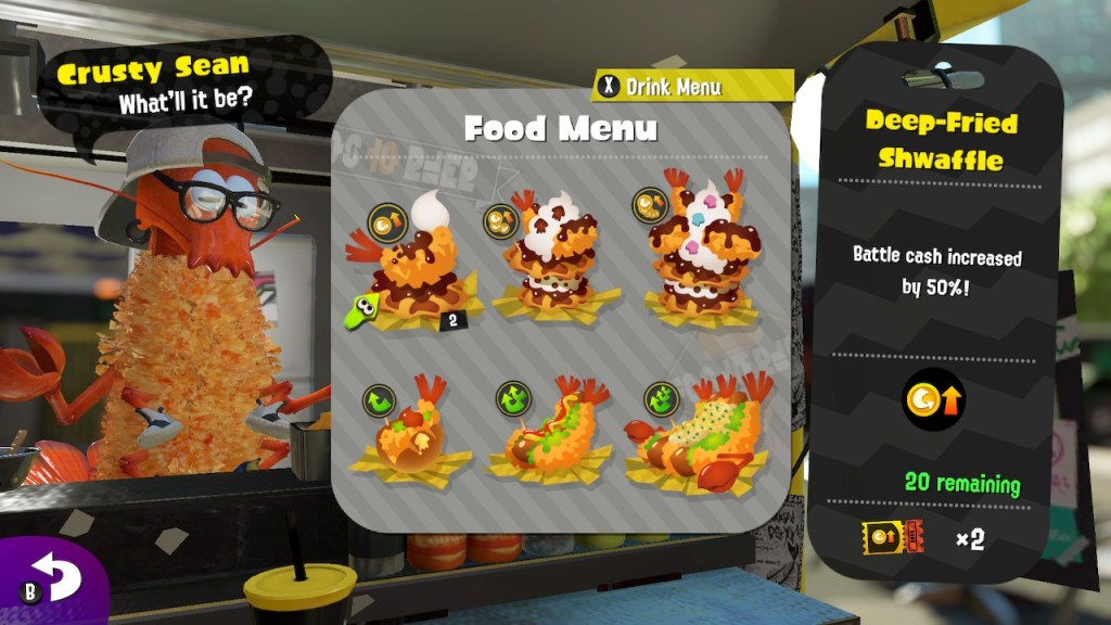 We also got two new friends, Murch and Crusty Sean. Murch is great for black market clothing internet purchases using the Nintendo app. Crusty Sean provides deliciously deep-fried snacks that increase cash and XP for a few matches, as long as you have tickets to spare.