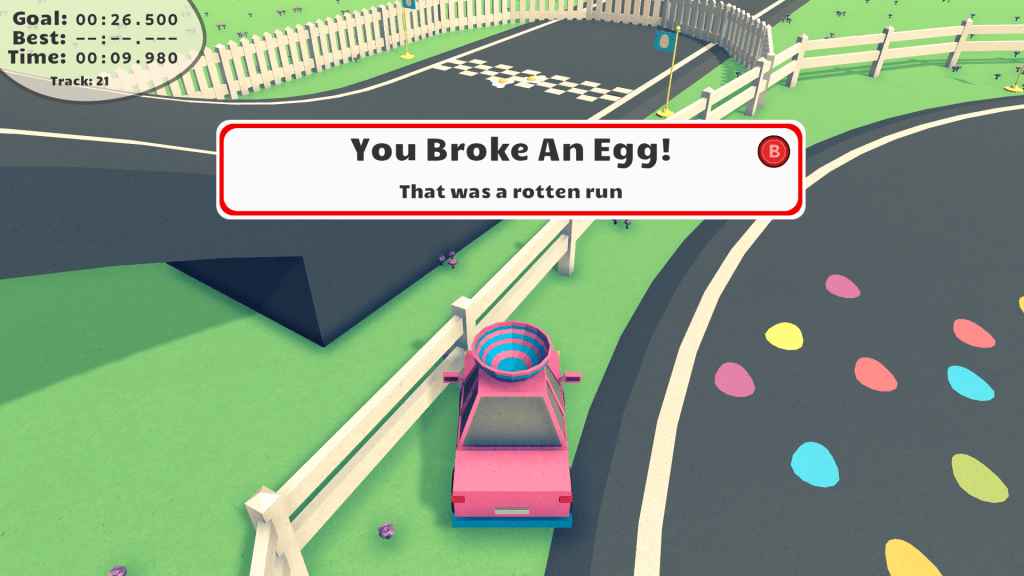 There are many small touches that make this game great. Failing in this game is just as fun as making it to the finish line at times. Failing is how you grab most of the in-game achievements. Anytime you crack an egg anywhere on or off the track it stays there throughout your remaining runs.