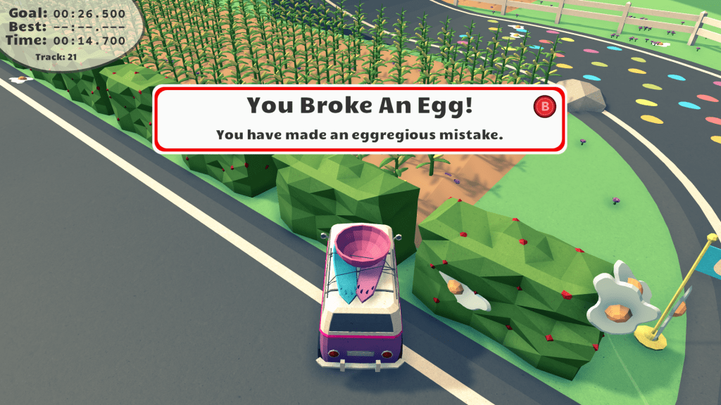 Tim Beaudet’s EGGcelerate! is a driving game where each level consists of attempting to make it through an obstacle course and past the finish line. Also, there’s an egg on top of your car in a bowl, and you must make sure the egg doesn’t fall out and crack before you reach the end of the level. Sounds simple right?