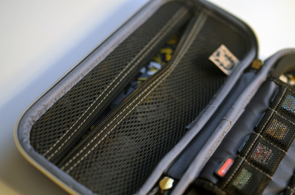 One thing I really love about this case over the RDS case is the accessories pocket. Instead of just a small pocket on the front of the Switch strap, this case has converted the top half of the case into a giant mesh accessories lounge with a zipper. Here you can store all kinds of goodies like more game cartridges, extra joy con controllers, snacks or even a charger. There’s so much space.