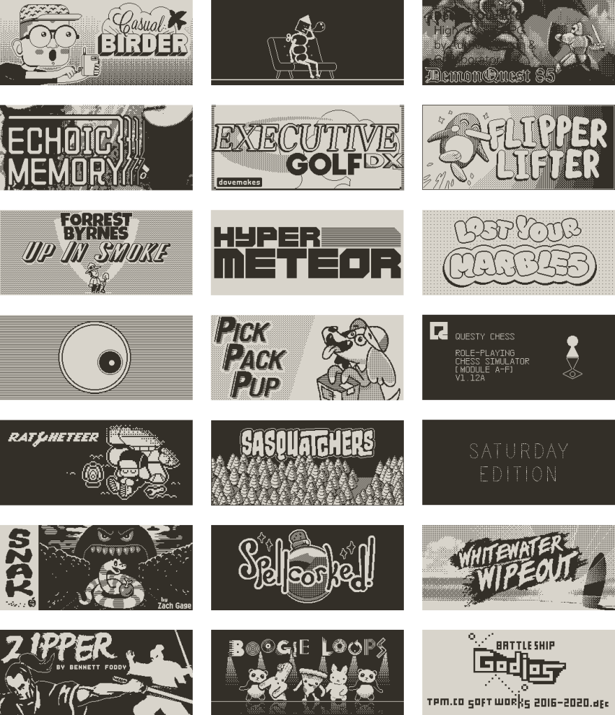 Casual Birder • Crankin's Time Travel Adventure • Demon Quest '85 • Echoic Memory • Executive Golf DX • Flipper Lifter • Forrest Byrnes: Up In Smoke • Hyper Meteor • Lost your Marbles • Omaze • Pick Pack Pup • Questy Chess • The Racheteer • Sasquatchers • Saturday Edition • Snak • Spellcorked • Whitewater Wipeout • Zipper • Boogie Loops • Battleship Godios