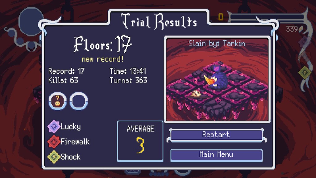 Any time you die, you get to see your “report card” immediately. This feature definitely is one way to get players to think Ok, just one more run. I can make it further. After each run you’ll get to see your number of kills, total time, turns/movements, and if you made it to a new record high floor.