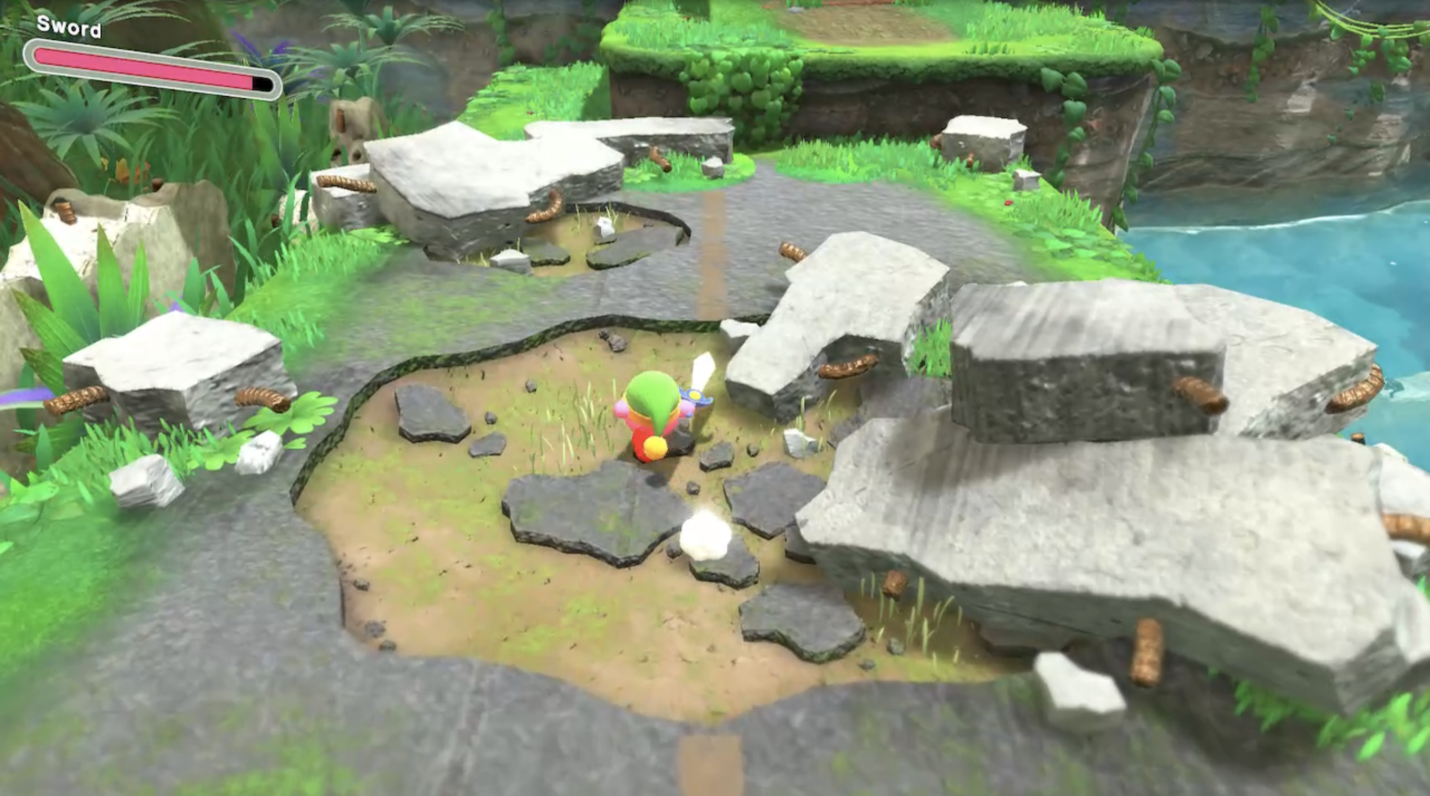 There are two things I find cool about copying enemy abilities in this game. For one, the abilities last nearly forever. In most games, when you find an ability or power up it is usually only for a limited time. In Kirby and the Forgotten Land, new abilities last until you take damage or drop them. Even after that, you can still pick them back up and continue using them.