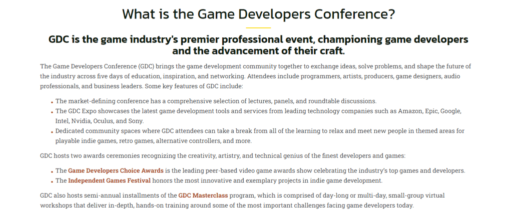 Something I learned this year is that GDC is also a networking event, mainly for students who are working towards a career in game development. I jumped into one of the virtual networking events one morning and ended up meeting a few students currently getting their degree. Some were already working in the industry while in school.