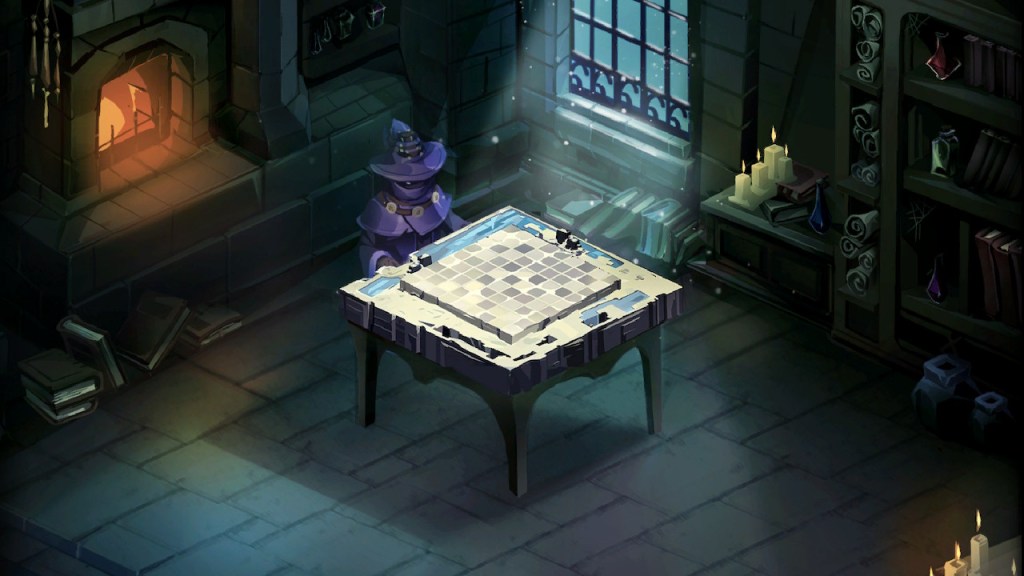 The turn-based combat takes place on a chessboard with waves of invading enemies. The story features two creatures playing a tactical tabletop game against each other where you control the heroes and have the ability to set different types of traps and obstructions.