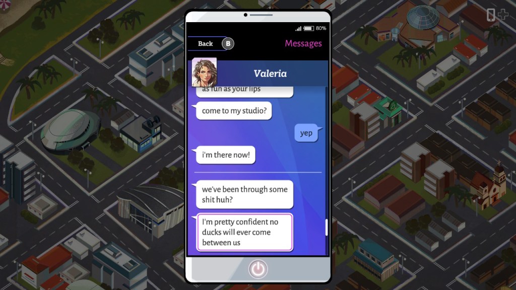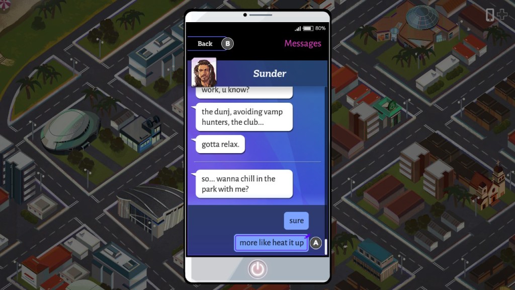 The point of the game is to meet all possible suitors, and take them on “dates” into the “dunj” (or dungeon), where they transform into weapons as you fight off hordes of living machines and objects. In between dates, you get to chat with different suitors (via text message and in-person). Cousin Jesse sort of works as your unofficial matchmaker.