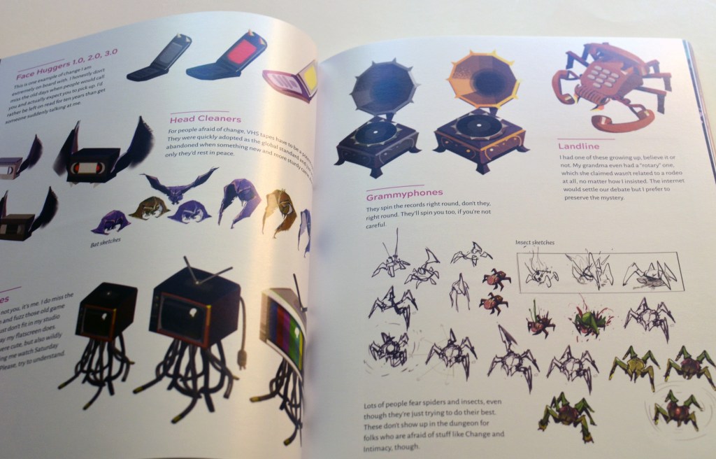 I was really excited about the art book for Boyfriend Dungeon, because the game itself features a few different art styles. First, we have the dungeon (or “dunj”) design, which features an isometric view with simple, stylized visuals. What initially got me excited to play Boyfriend Dungeon was seeing some dungeon gameplay footage.