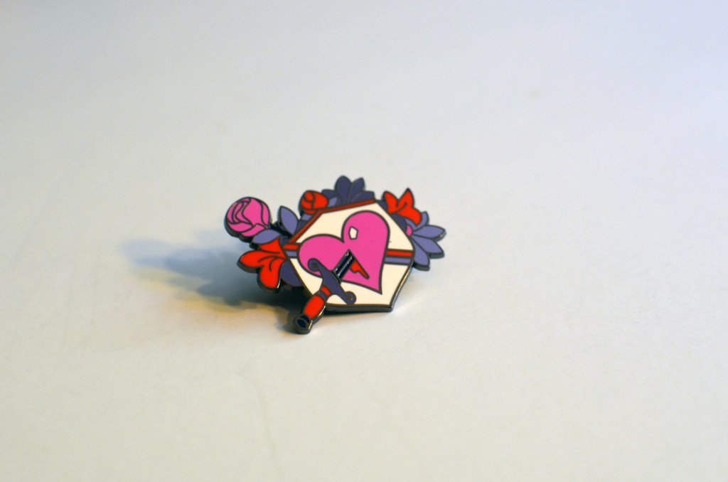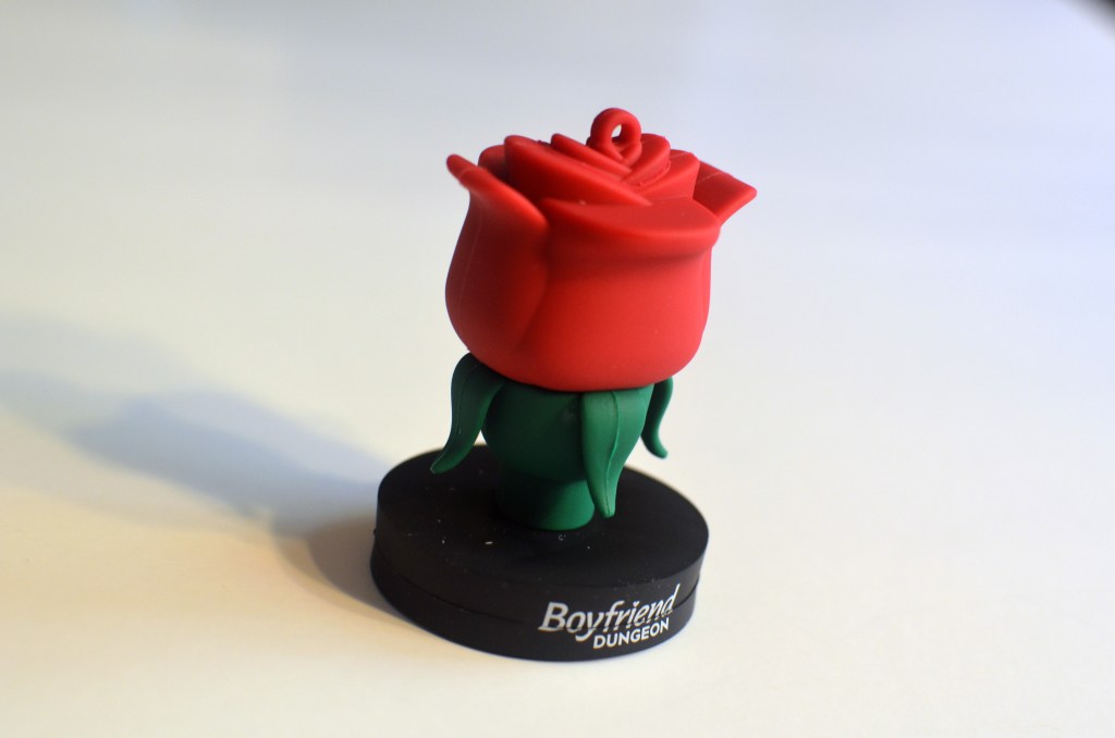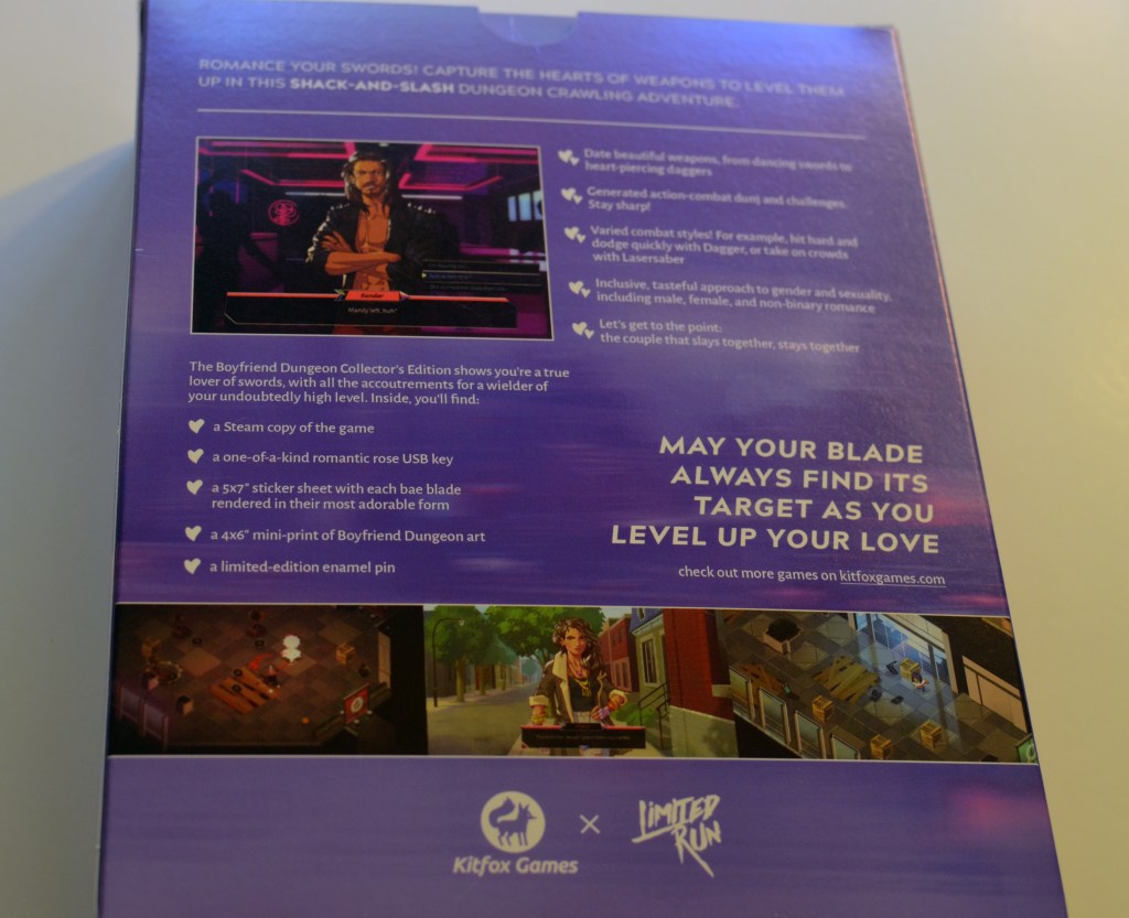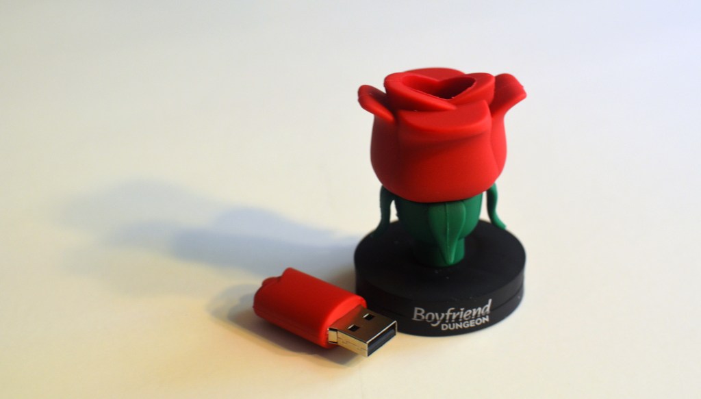 I love that the collector’s edition of Boyfriend Dungeon came in a cereal-sized box. Even though the game itself is a Steam download code on a card, it’s the other bonus gifts that make this a fun collector’s edition. Plus, the box is just nice to display (if you have the space). In this large box I received an 8 GB romantic rose USB Drive. There was also a sticker sheet with cute versions of each bae blade character from the game, a game soundtrack on CD, and a limited-edition enamel pin.