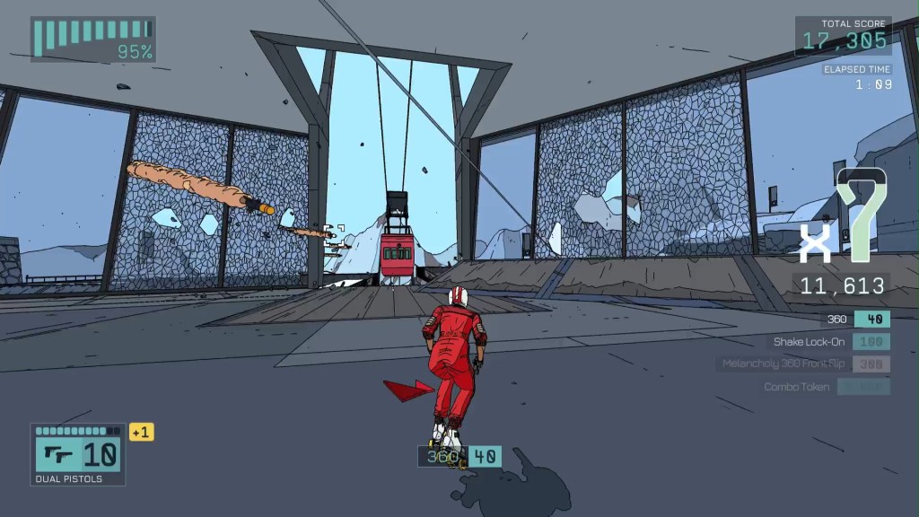 It’s like the creative team was sitting in a room one day — possibly playing Tony Hawk’s Pro Skater 1 + 2 — thinking, We love skating and extreme sports games, how can we make them even cooler? Guns? Bad Guys? Roller Skates? The Future?