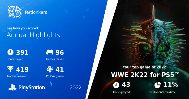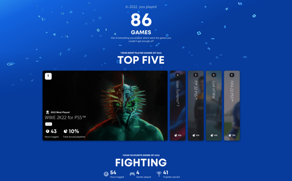 In 2022, I played a total of 86 games (67 in 2021). My top five games played on PlayStation were WWE 2K22 (for 43 hours), followed by Gran Turismo 7, F1 2022, God of War (2018), and FIFA 22. The wrap-up named “Fighting” games as my number one genre, because of WWE 2K22, but I would say my top genre looks more to be “Sports” games, or even driving games. I had beaten God of War (2018) when it first came out, but replayed the main story to prepare for God of War: Ragnarok which I’m currently playing.