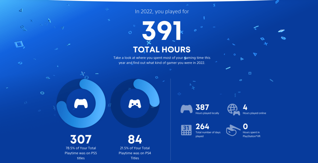 Last week, I received not one, but two “Gaming Year in Review 2022” emails (from PlayStation and Nintendo). The PlayStation Wrap-Up featured much of the same categories as last year, while Nintendo provided way less than last year.