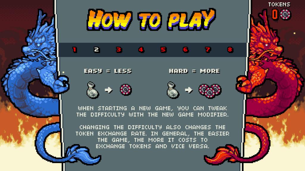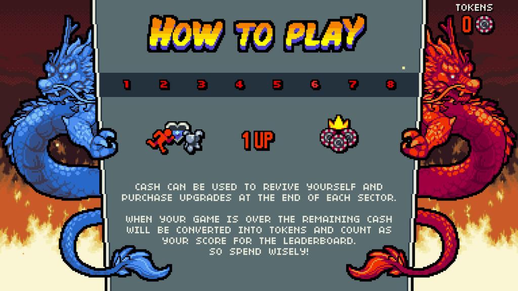 This game is quite clever in the way it disguises itself as a roguelite using classic arcade cabinet features. In between levels players must choose to spend their hard earned money on new skills or tokens. Tokens which may be used in the moment to keep your run alive, or for permanent upgrades in the main menu.