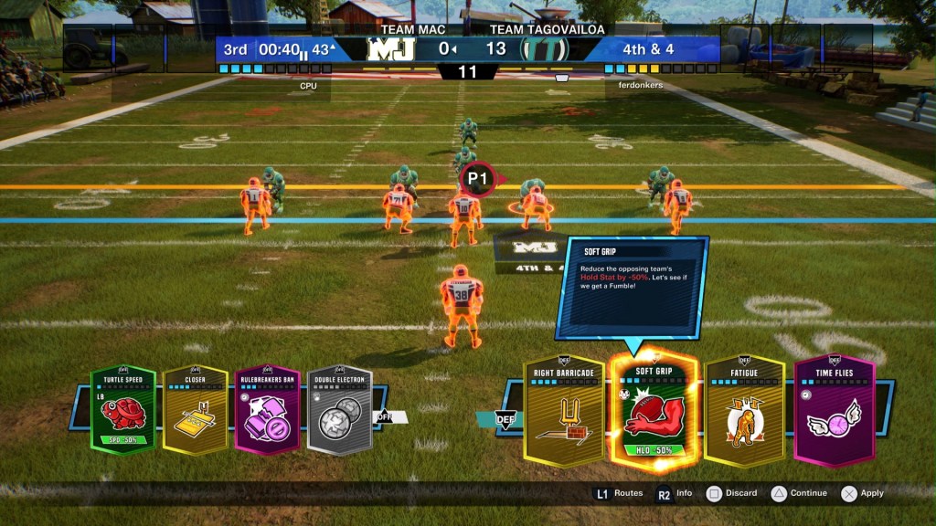 I like the idea of including “Wild Cards” as a twist on the classic football game. Some cards allow players to power up their own team, while others mess with the dynamic of the opposing team. I found many of the cards to not be very useful, but I still have many cards left to unlock (like the UFO and Hot Potato). If the game is going to lean into the wacky use of Wild Cards, the on-field gameplay needs to take itself a little less seriously and once again go the route of an arcade-style game (aka NFL Blitz).