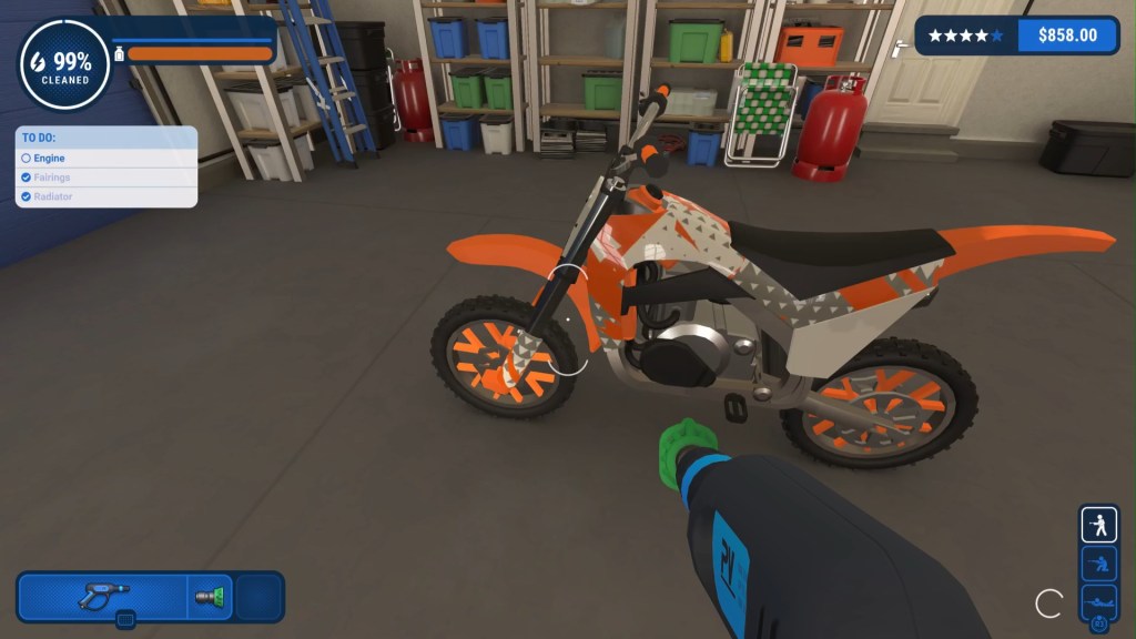 PowerWash Simulator does not kill your forearms, like the real thing. It’s a relaxing, enjoyable, fulfilling task. The game does get a bit tedious when searching for hidden, unwashed areas. What makes the game fun is the variety of structures and objects to clean. You start off with the basics — cars, vans, motorcycles, homes. The added DLC has been compelling for fans of different genres.