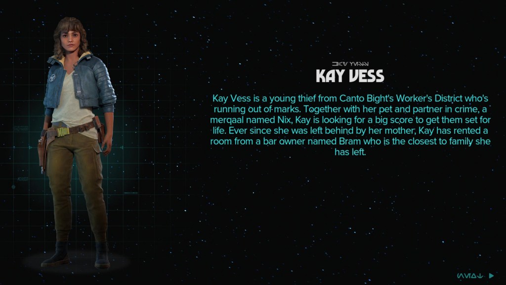 Early on, there was a small nod to the Resistance, where Kay was asked to join. She instead asked, “How much does it pay?” Which told me this is not her deal. I’m not too far into the game so the Resistance can make their way back into this story. Kay is no saint, but she also isn’t evil. She’s just looking out for herself and her pal, Nix — the cutest little critter in the galaxy.