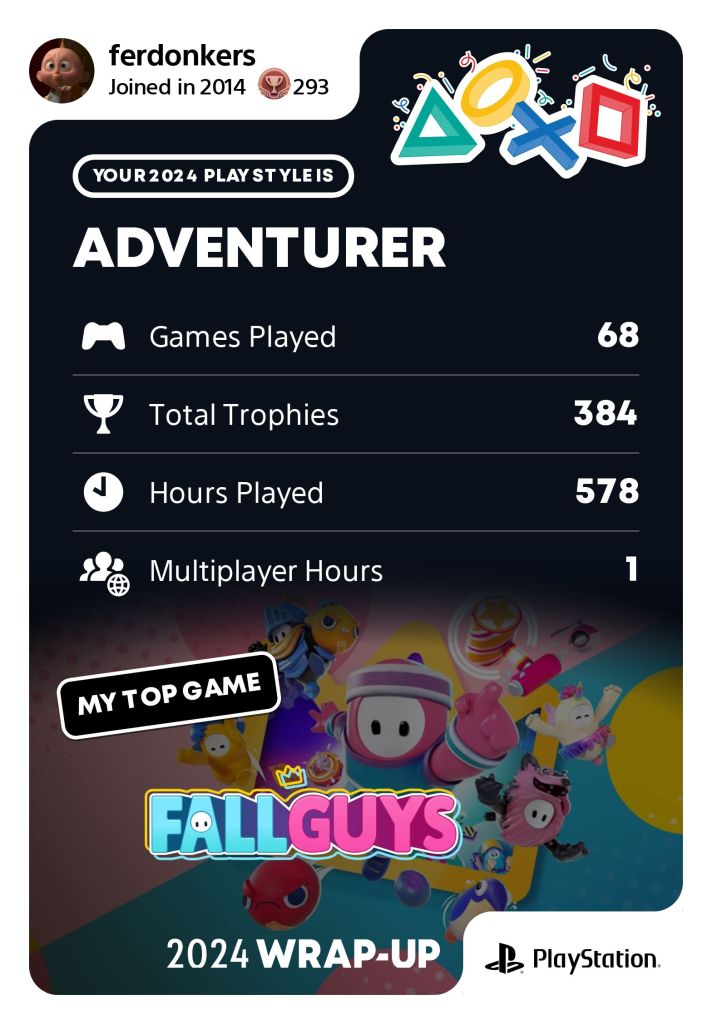 Now that I’ve received both — my PlayStation and Nintendo — gaming wrap-ups for 2024, it’s time to share. From 2023 to 2024, my overall stats remained pretty consistent. This year, I played a total of 126 games (68 on PlayStation 5 and 58 on Nintendo Switch). That’s only ten less than the total number of games played in 2023 (136) — 71 on PlayStation 5 and 65 on Nintendo Switch.