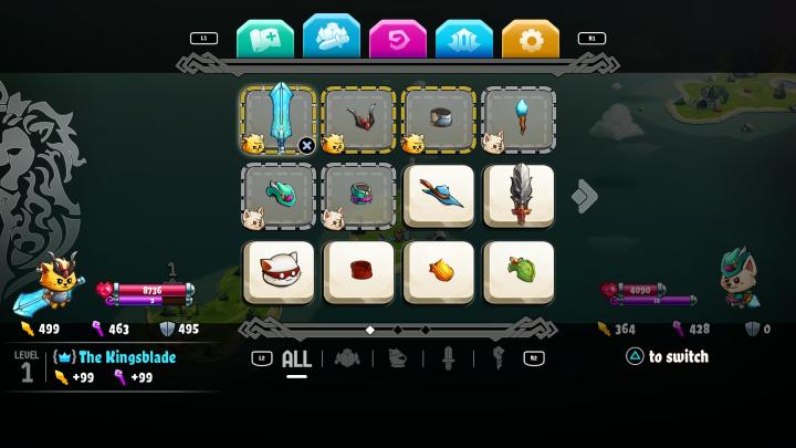 Cat Quest III still implements that same gameplay loop, but there are much more quality improvements — even the art style has more detail. The pause menu now features more pages of customization — from outfits to weapons to trinkets (or power ups). There are even new side-arm weapons — guns and wands — allowing you to switch weapons.