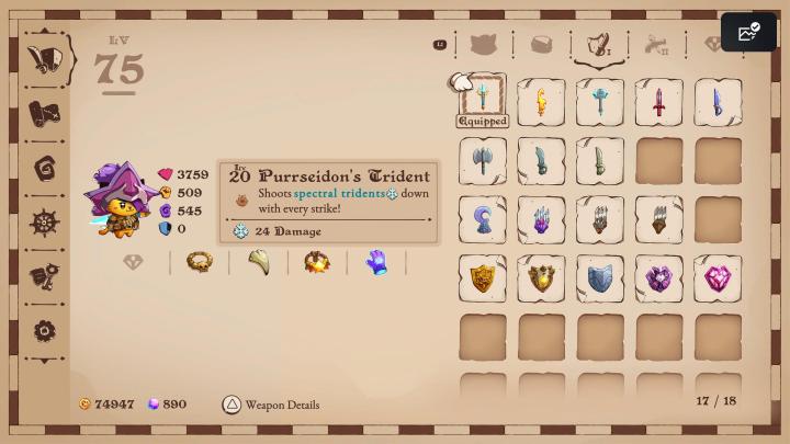 There is also a full page of ship customization in the menu. As you level up you can add more features to your ship. This goes with most pages — as you level up you can carry more trinkets and magic spells. We definitely enjoyed Cat Quest III the most, and there’s still much end game content to complete.