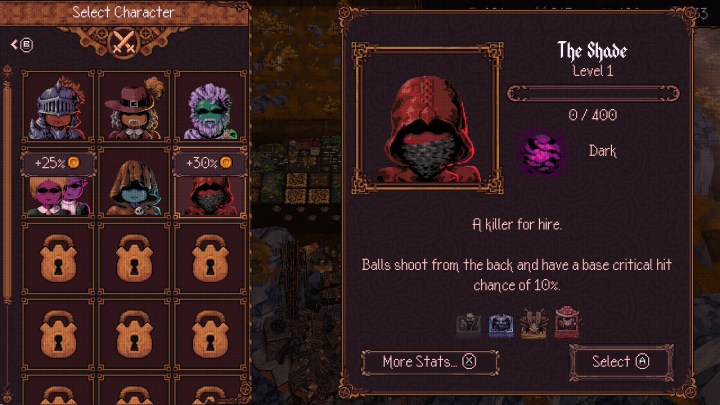 There are many heroes to choose from in BALL x PIT, and I have only unlocked a handful thus far. Each hero begins their journey with their own set of stats, which will upgrade as you level them up by battling in the pit. They also have their own starter ability and unique trait — some useful, while some may be counterproductive.