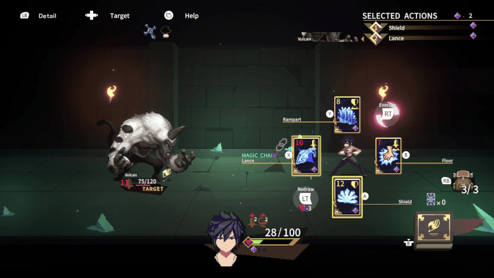 Fairy Tail: Dungeons’s combat is similar in that each hero has their three action points per round to play cards (most cost one-to-two action points). Cards can block, hit, heal, or modify future actions. There are also magic chains, which make the most out of your turn. Instead of playing cards, opponents just attack or defend. Big opponent actions can be countered by performing certain acts leading up to their action (ex. Deal X damage in the next two turns to stop this MONSTER ATTACK!).