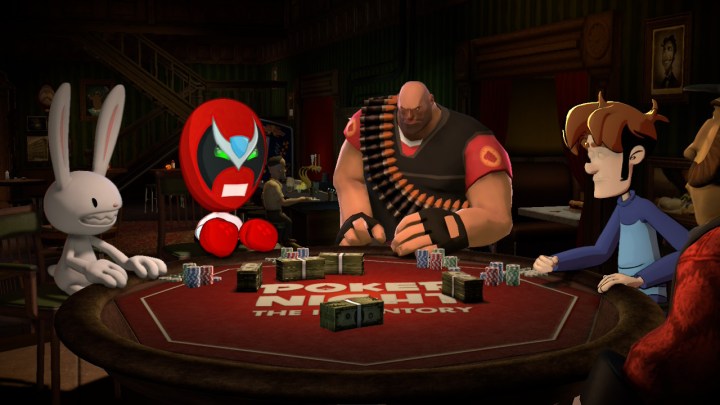 Telltale Games‘ 2010 release Poker Night at the Inventory granted entry to the masses by pitting players against four Inventory regulars: Max, the hyperkinetic rabbity-thing of Sam & Max fame; Homestar Runner‘s boxing gloved hero Strong Bad; Penny Arcade‘s sardonic headliner Tycho Brahe; and Team Fortress 2‘s fan-favorite mercenary the Heavy.